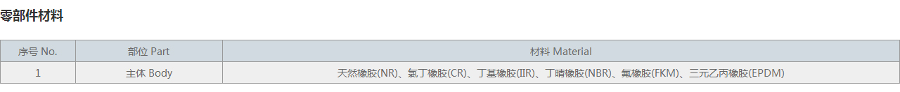 | 1 | 主體 Body | 天然橡膠(NR)、氯丁橡膠(CR)、丁基橡膠(IIR)、丁晴橡膠(NBR)、氟橡膠(FKM)、三元乙丙橡膠(EPDM) |
