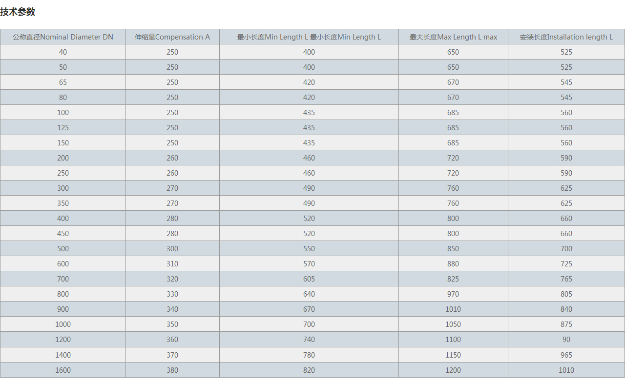 | 公稱直徑Nominal Diameter DN | 伸縮量Compensation A | 很小長(zhǎng)度Min Length L 很小長(zhǎng)度Min Length L | 很大長(zhǎng)度Max Length L max | 安裝長(zhǎng)度Installation length L |