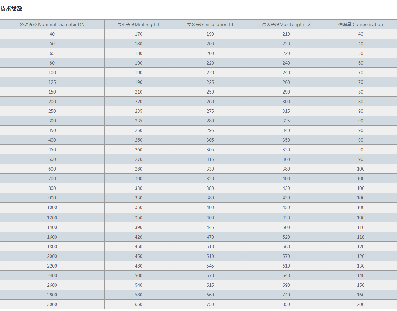 | 公稱通徑 Nominal Diameter DN | 很小長度Minlength L | 安裝長度Installation L1 | 很大長度Max Length L2 | 伸縮量 Compensation |