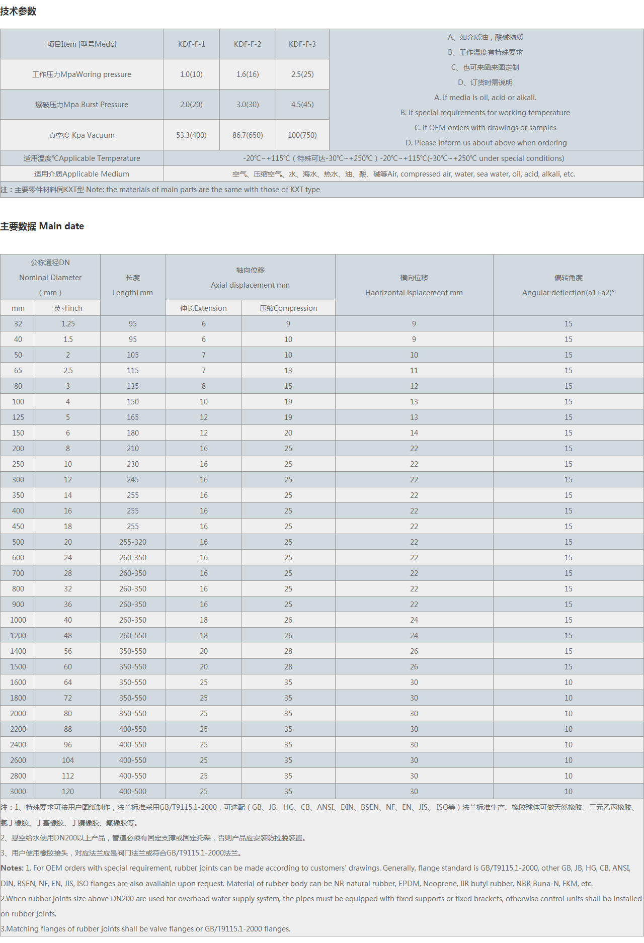 KDF-F翻邊型橡膠軟接頭更是改良了單球體橡膠接頭在過高的壓力下發(fā)生的拉脫狀況,改良后的大翻邊橡膠接頭密封面與平焊法蘭外徑一致,而且球體密封面上有鉆孔,完全將橡膠接頭與管道連接成一個整體,從而提高了橡膠接頭使用的穩(wěn)定性。它是一種高彈性、高氣密性、耐介質(zhì)性和耐氣候性的管道接頭。由于可曲撓橡膠軟接頭有良好的綜合性能,主要用于原水和污水的提升和輸送,火力發(fā)電廠的給水和冷卻循環(huán)水,冶金行業(yè),冷凝水,化工行業(yè)的化學(xué)物質(zhì)的管道輸送,石化行業(yè)的冷卻,稀釋及其它行業(yè)長短距離管線間的柔性連接。因為橡膠具有較高的耐磨性,還適用于一切行業(yè)的粒狀和粉狀及汽體的輸送。