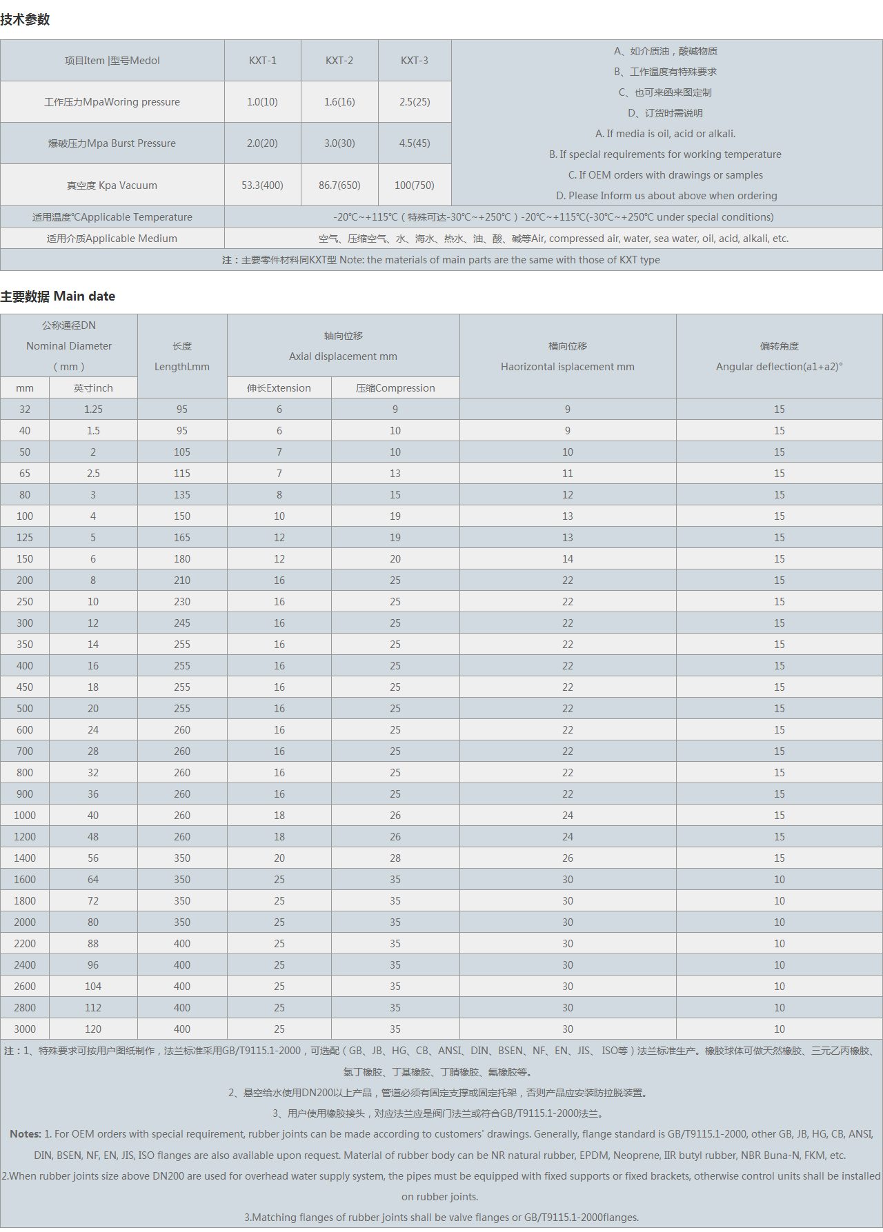 | 注:1、特殊要求可按用戶圖紙制作,可選配(GB、JB、HG、CB、ANSI、DIN、BSEN、NF、EN、JIS、 等)法蘭標(biāo)準(zhǔn)生產(chǎn)。橡膠球體可做天然橡膠、三元乙丙橡膠、氯丁橡膠、丁基橡膠、丁腈橡膠、氟橡膠等。 2、懸空給水使用DN200以上產(chǎn)品,管道必須有固定支撐或固定托架,否則產(chǎn)品應(yīng)安裝防拉脫裝置。 3、用戶使用橡膠接頭,對應(yīng)法蘭應(yīng)是閥門法蘭。 Notes: 1. For OEM orders with special requirement, rubber joints can be made according to customers' drawings. Generally, flange standard is , other GB, JB, HG, CB, ANSI, DIN, BSEN, NF, EN, JIS, flanges are also available upon request. Material of rubber body can be NR natural rubber, EPDM, Neoprene, IIR butyl rubber, NBR Buna-N, FKM, etc. 2.When rubber joints size above DN200 are used for overhead water supply system, the pipes must be equipped with fixed supports or fixed brackets, otherwise control units shall be installed on rubber joints. 3.Matching flanges of rubber joints shall be valve flanges or flanges. |