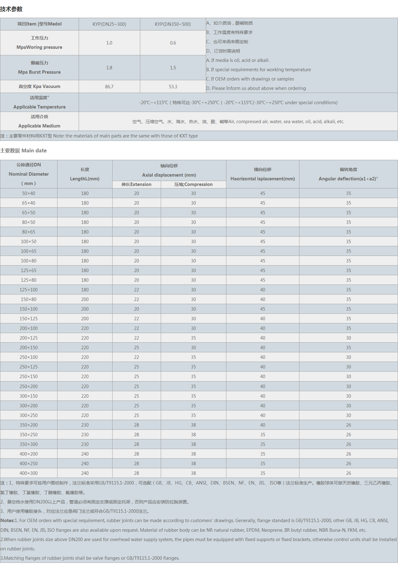 | 項(xiàng)目Item |型號(hào)Medol | KYP(DN25~300) | KYP(DN350~500) | A、如介質(zhì)油,酸堿物質(zhì) B、工作溫度有特殊要求 C、也可來(lái)函來(lái)圖定制 D、訂貨時(shí)需說(shuō)明 A. If media is oil, acid or alkali. B. If special requirements for working temperature C. If OEM orders with drawings or samples D. Please Inform us about above when ordering |